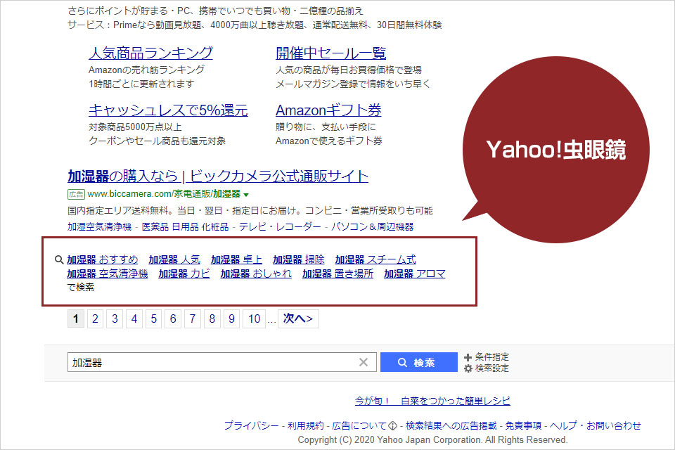 当社では、このサジェスト対策と、Google関連キーワードエリア & Yahoo!虫眼鏡エリア に表示されるキーワードの大きく2つの対策を行うことが出来ます。